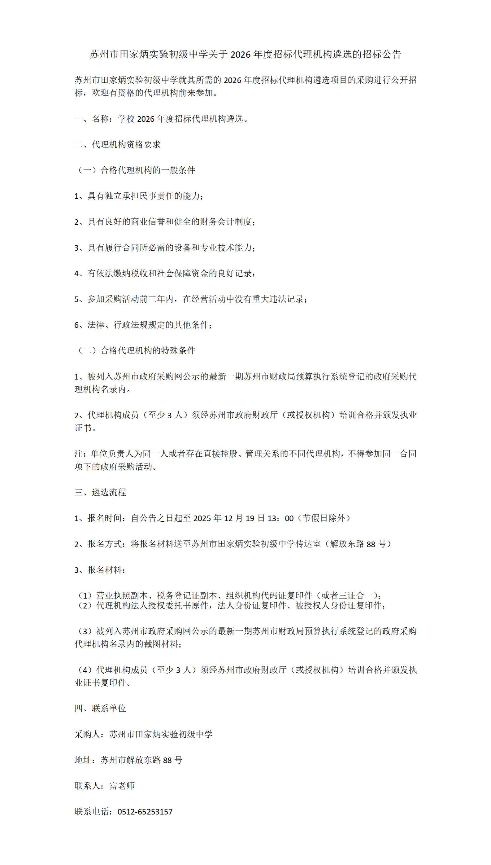 苏州市田家炳实验初级中学关于2026年度招标代理机构遴选的招标公告